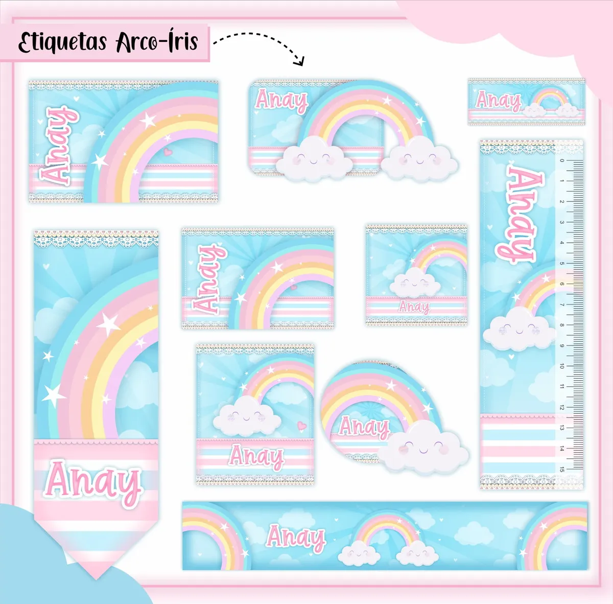 Arquivo Corte Etiqueta Escolar Arco Iris. Ideal para o início do ano letivo, aniversários, eventos escolares ou para facilitar a identificação de materiais de uso coletivo,