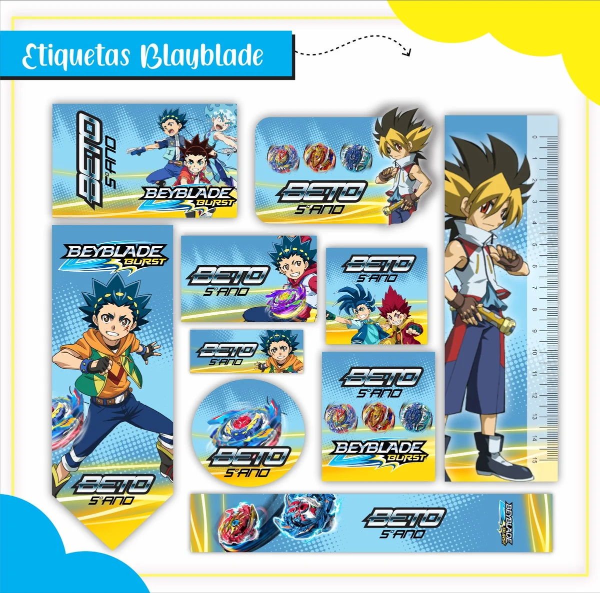 Arquivo Corte Etiqueta Escolar Beyblade. Ideal para o início do ano letivo, aniversários, eventos escolares ou para facilitar a identificação de materiais de uso coletivo,