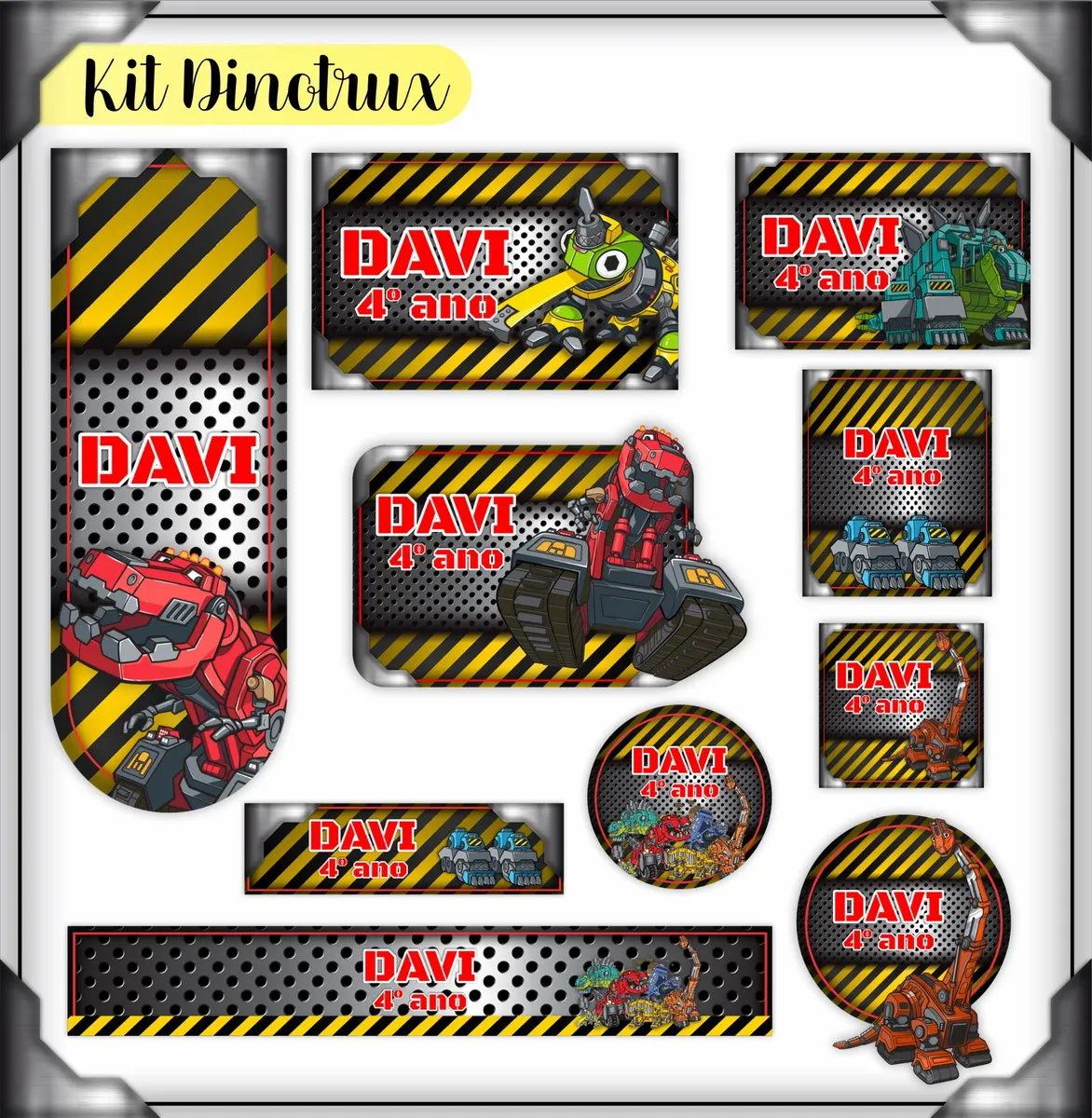 Arquivo Corte Etiqueta Escolar Dinotrux. Ideal para o início do ano letivo, aniversários, eventos escolares ou para facilitar a identificação de materiais de uso coletivo,