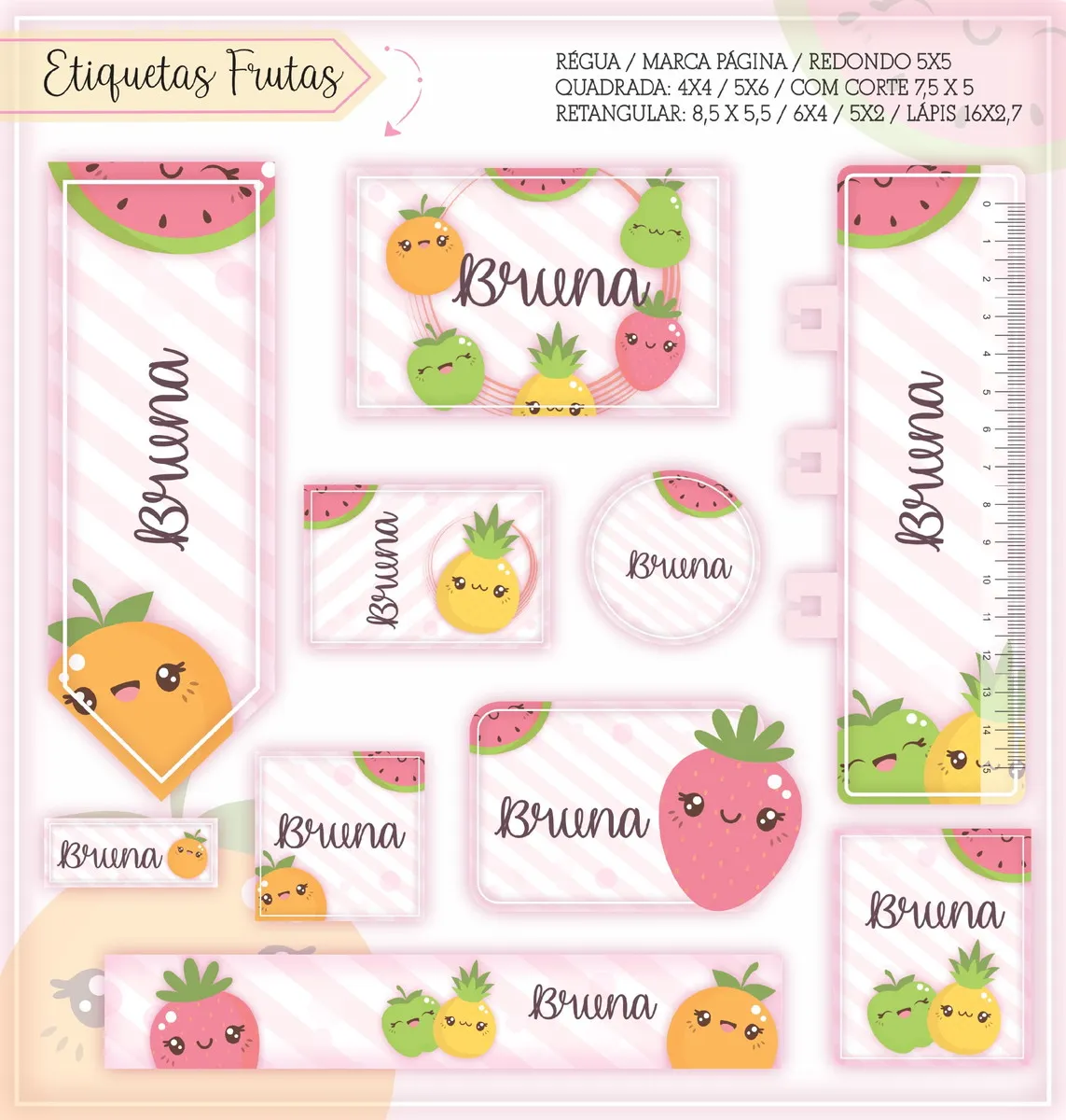 Arquivo Corte Etiqueta Escolar Frutinhas. Ideal para o início do ano letivo, aniversários, eventos escolares ou para facilitar a identificação de materiais de uso coletivo,