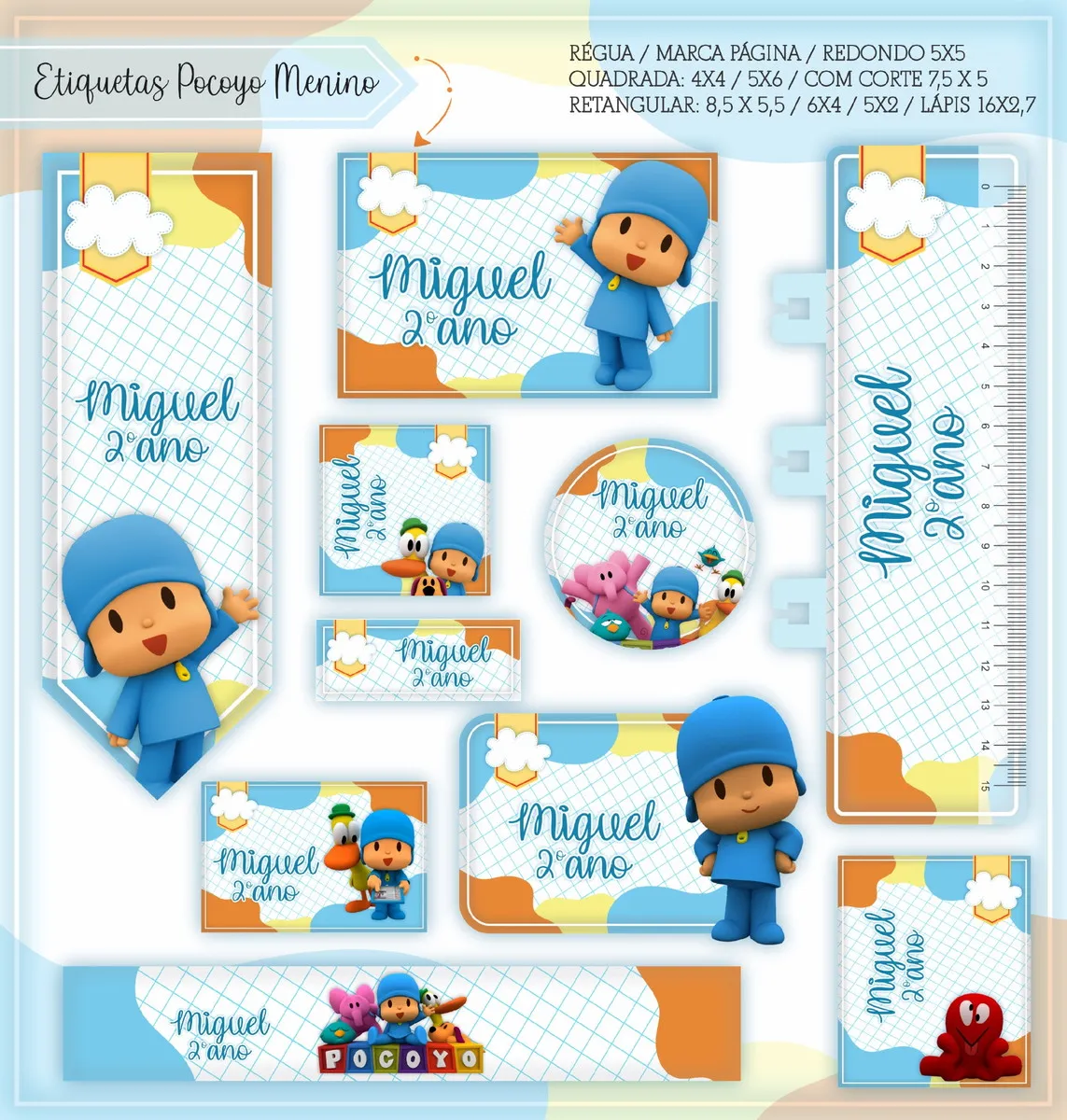 Arquivo Corte Etiqueta Escolar Pocoyo. Ideal para o início do ano letivo, aniversários, eventos escolares ou para facilitar a identificação de materiais de uso coletivo,