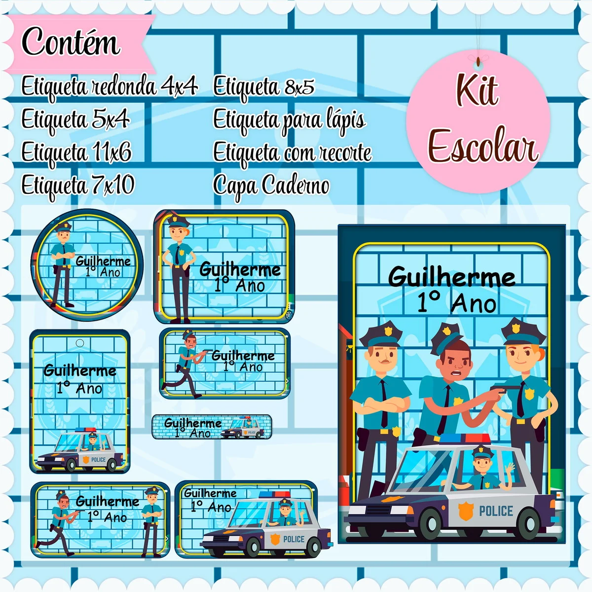Arquivo Corte Etiqueta Escolar Polícia. Ideal para o início do ano letivo, aniversários, eventos escolares ou para facilitar a identificação de materiais de uso coletivo,