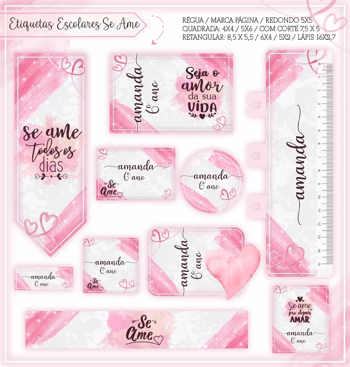 Arquivo Corte Etiqueta Escolar Se Ame. Ideal para o início do ano letivo, aniversários, eventos escolares ou para facilitar a identificação de materiais de uso coletivo,