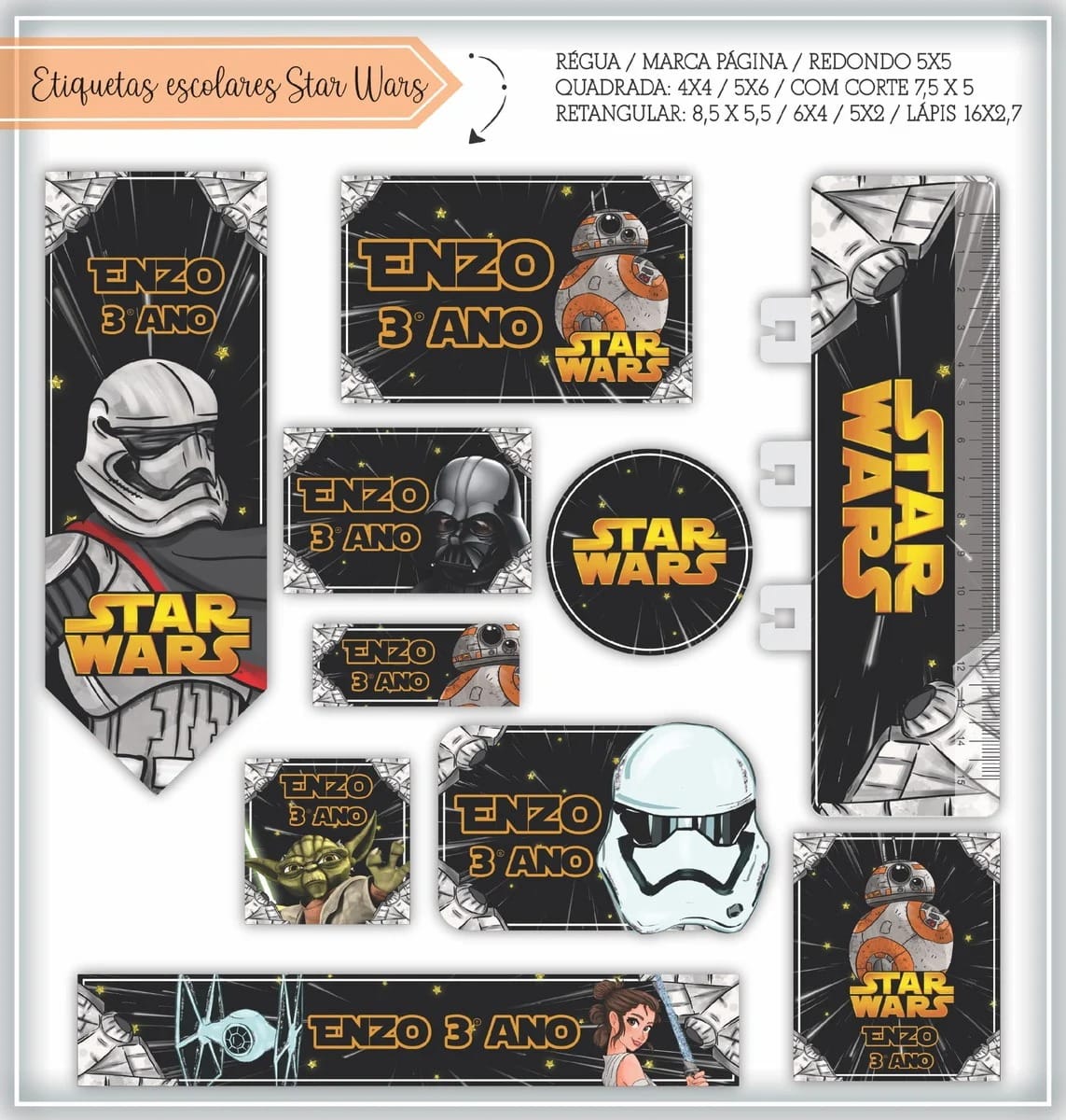 Arquivo Corte Etiqueta Escolar Star Wars. Ideal para o início do ano letivo, aniversários, eventos escolares ou para facilitar a identificação de materiais de uso coletivo,