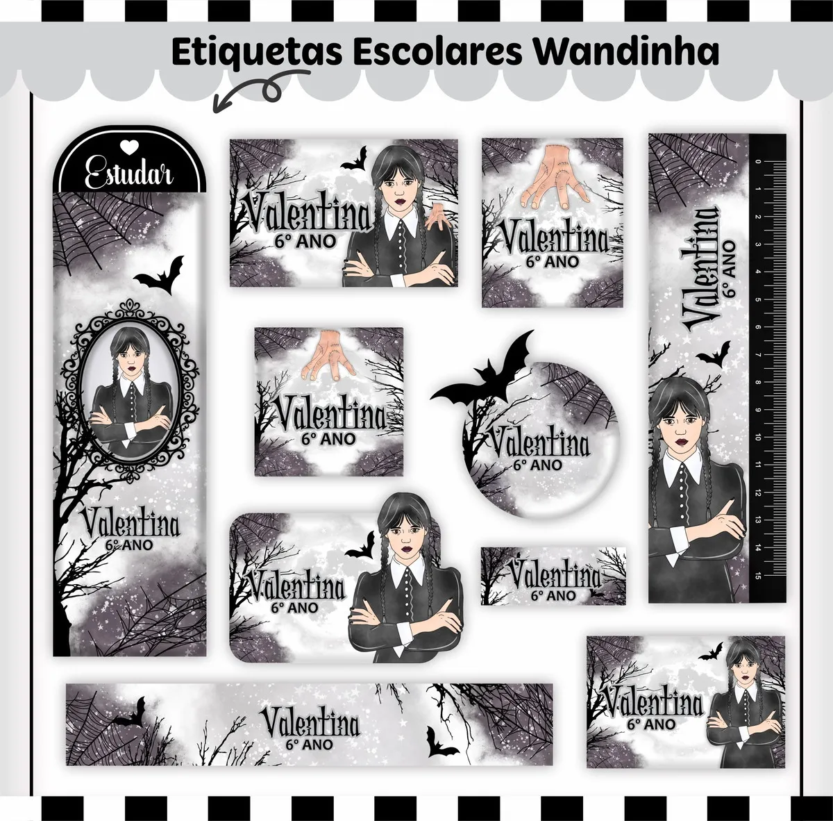 Transforme a organização escolar com nosso Arquivo Corte Etiqueta Escolar Wandinha, desenvolvido especialmente para facilitar a personalização e impressão em casa! Ideal para pais, alunos e educadores, esse arquivo oferece praticidade e estilo na hora de identificar itens escolares, como mochilas, cadernos, lápis, e muito mais.