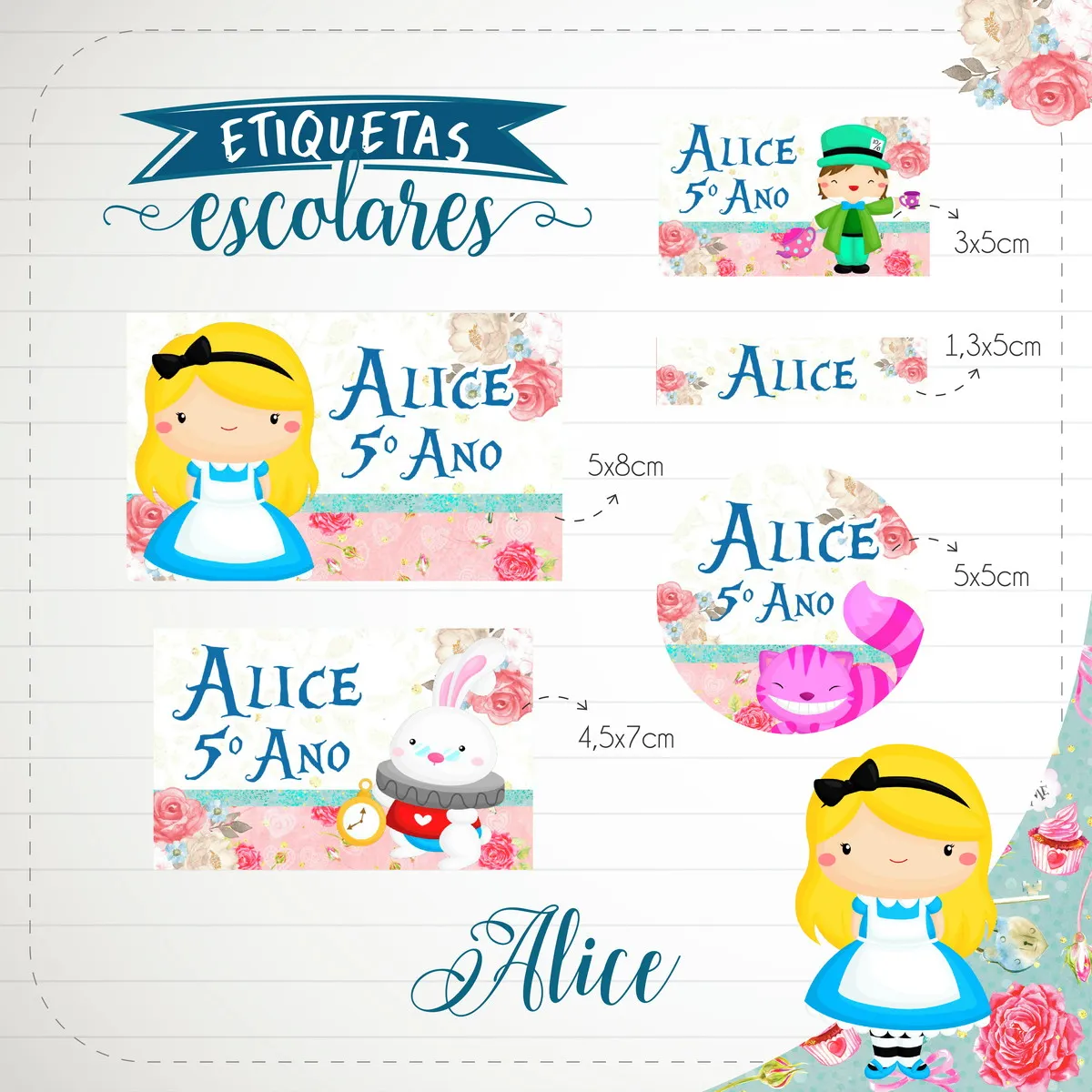 Arquivo de Corte Etiqueta Escolar Alice. Ideal para o início do ano letivo, aniversários, eventos escolares ou para facilitar a identificação de materiais de uso coletivo,