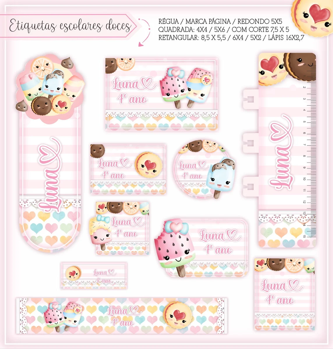Arquivo de Corte Etiqueta Escolar Doces. Ideal para o início do ano letivo, aniversários, eventos escolares ou para facilitar a identificação de materiais de uso coletivo,