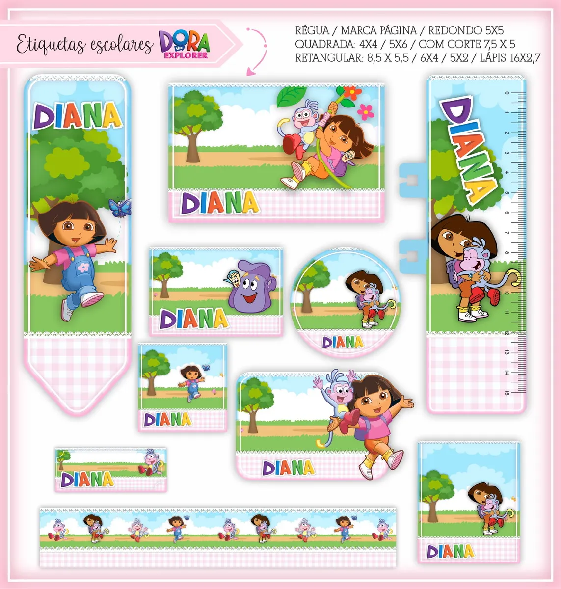 Arquivo de Corte Etiqueta Escolar Dora. Ideal para o início do ano letivo, aniversários, eventos escolares ou para facilitar a identificação de materiais de uso coletivo,
