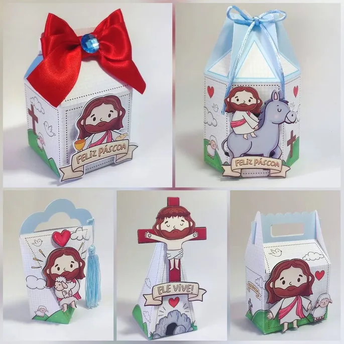 Modelos exclusivos de caixinhas temáticas de Páscoa com Cristo;