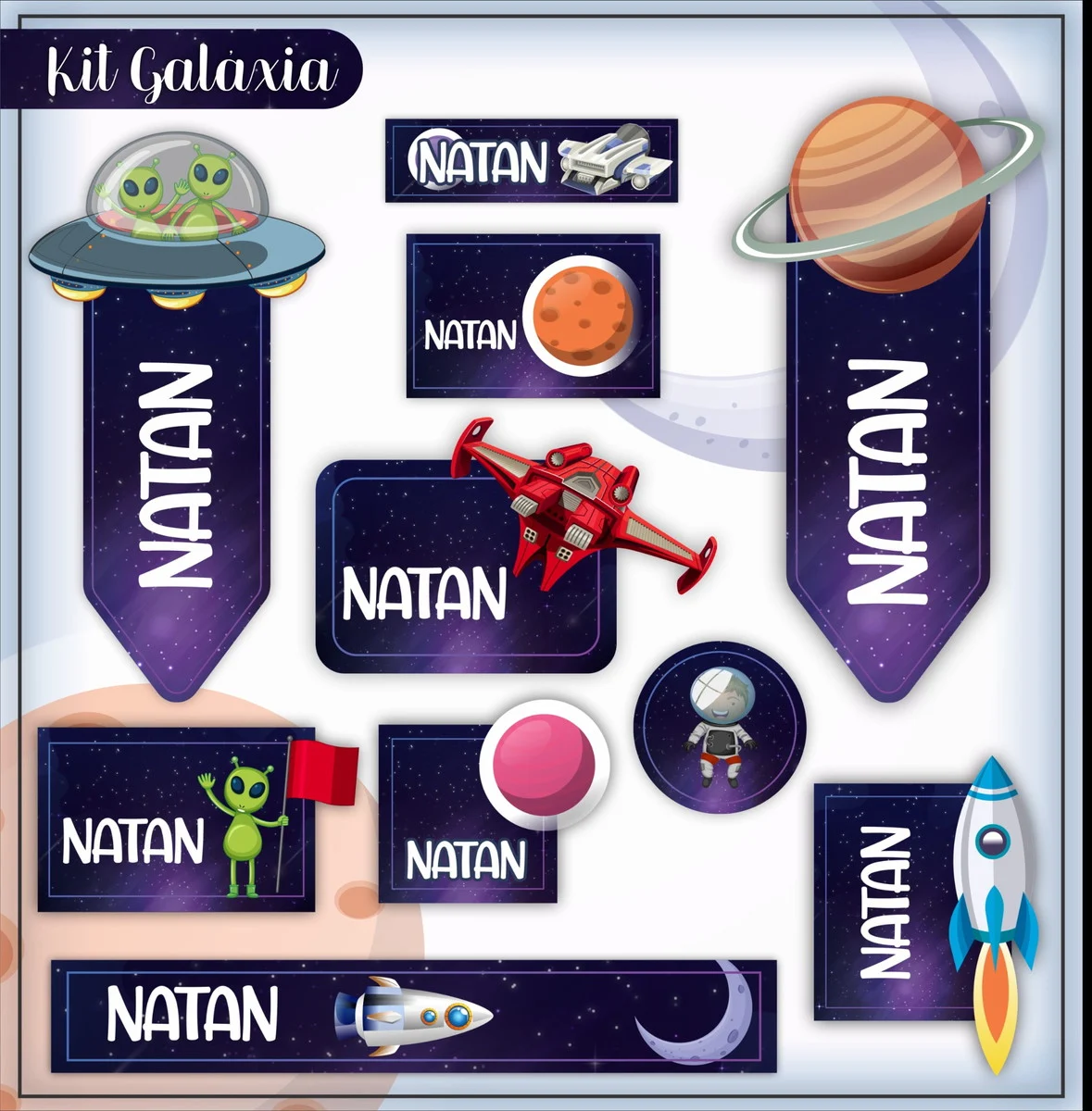 Arquivo Digital Etiqueta Escolar Galáxia. Ideal para o início do ano letivo, aniversários, eventos escolares ou para facilitar a identificação de materiais de uso coletivo,