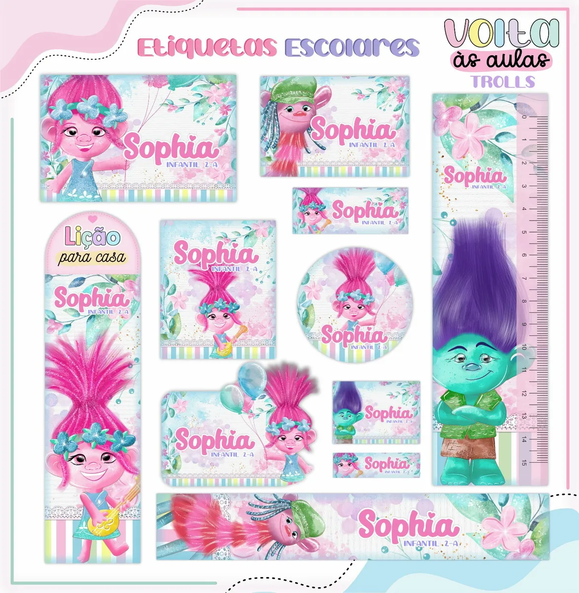 Arquivo Digital Etiqueta Escolar Trolls. Ideal para o início do ano letivo, aniversários, eventos escolares ou para facilitar a identificação de materiais de uso coletivo,