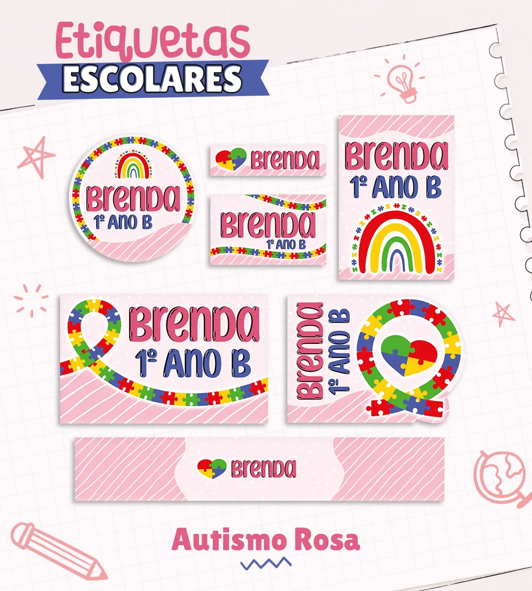 Arquivo Etiqueta Escolar Autismo Rosa. Ideal para o início do ano letivo, aniversários, eventos escolares ou para facilitar a identificação de materiais de uso coletivo,
