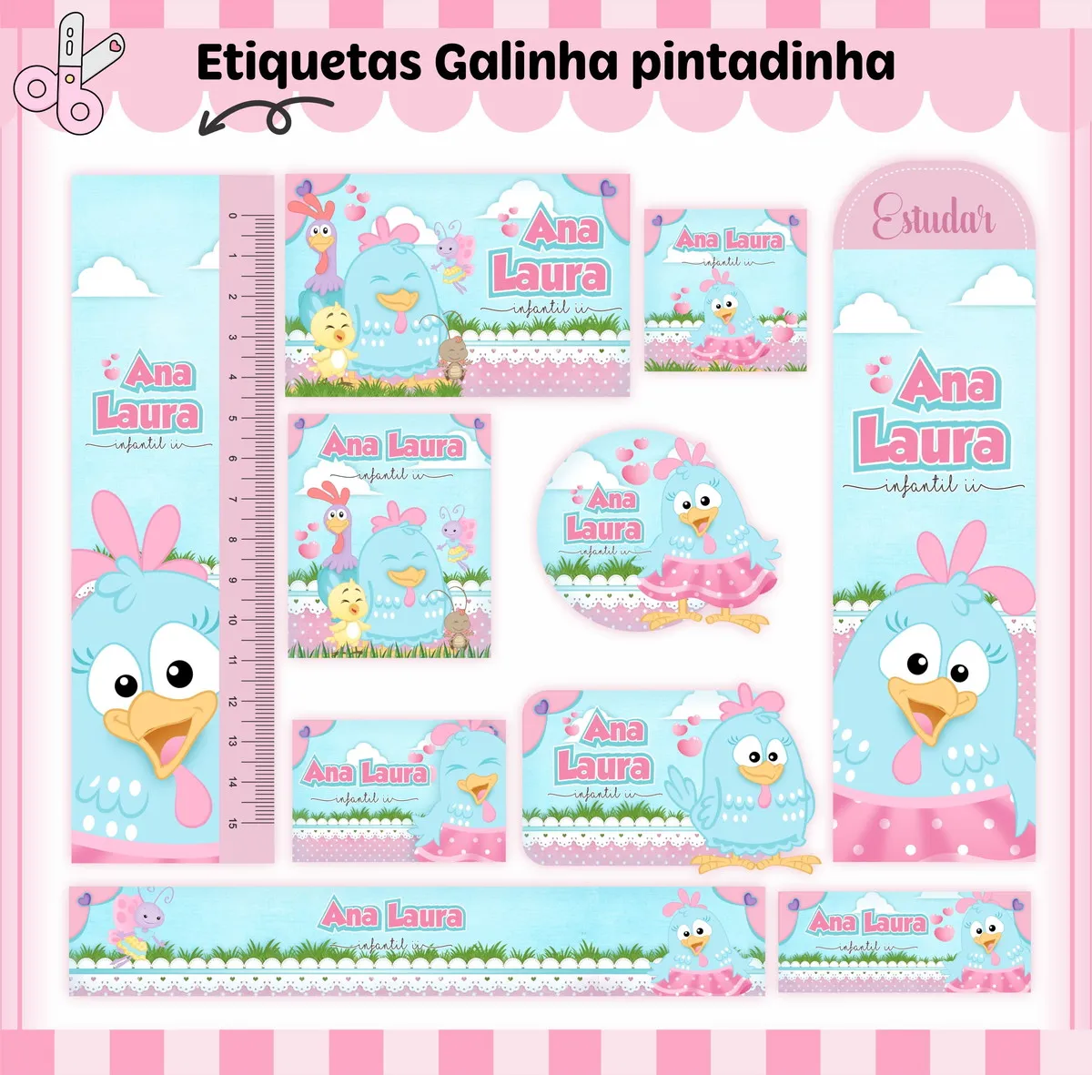 Arquivo Etiqueta Escolar Galinha Candy. Ideal para o início do ano letivo, aniversários, eventos escolares ou para facilitar a identificação de materiais de uso coletivo,