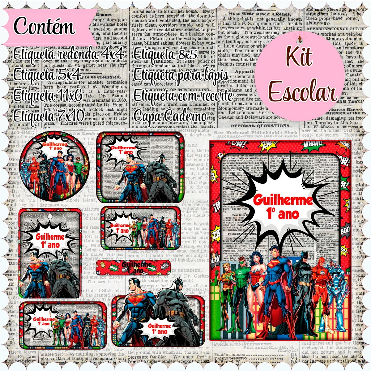 Transforme a organização escolar com nosso Arquivo Etiqueta Escolar Liga da Justiça, desenvolvido especialmente para facilitar a personalização e impressão em casa! Ideal para pais, alunos e educadores, esse arquivo oferece praticidade e estilo na hora de identificar itens escolares, como mochilas, cadernos, lápis, e muito mais.