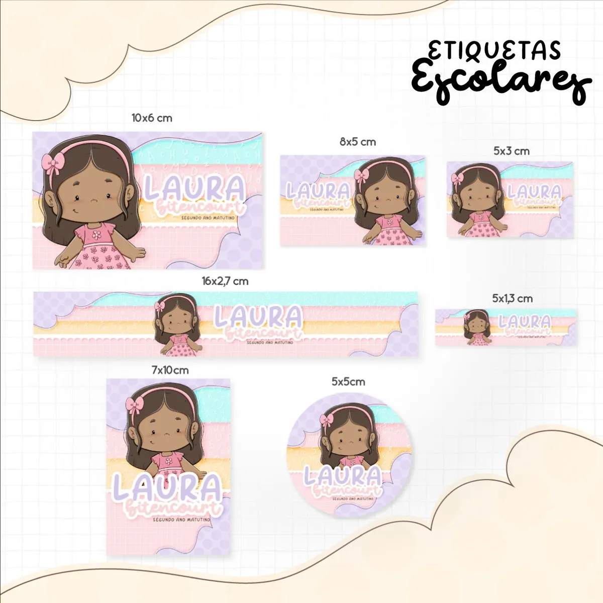 Arquivo Etiqueta Escolar Menina Negra. Ideal para o início do ano letivo, aniversários, eventos escolares ou para facilitar a identificação de materiais de uso coletivo,