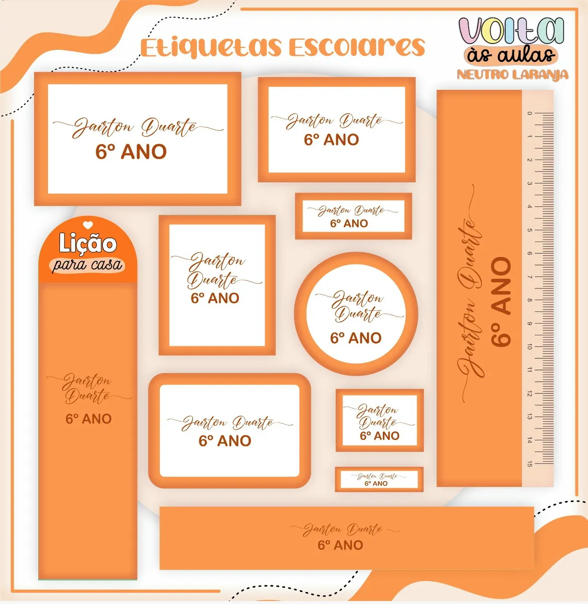 Arquivo Etiqueta Escolar Neutro Laranja. Ideal para o início do ano letivo, aniversários, eventos escolares ou para facilitar a identificação de materiais de uso coletivo,