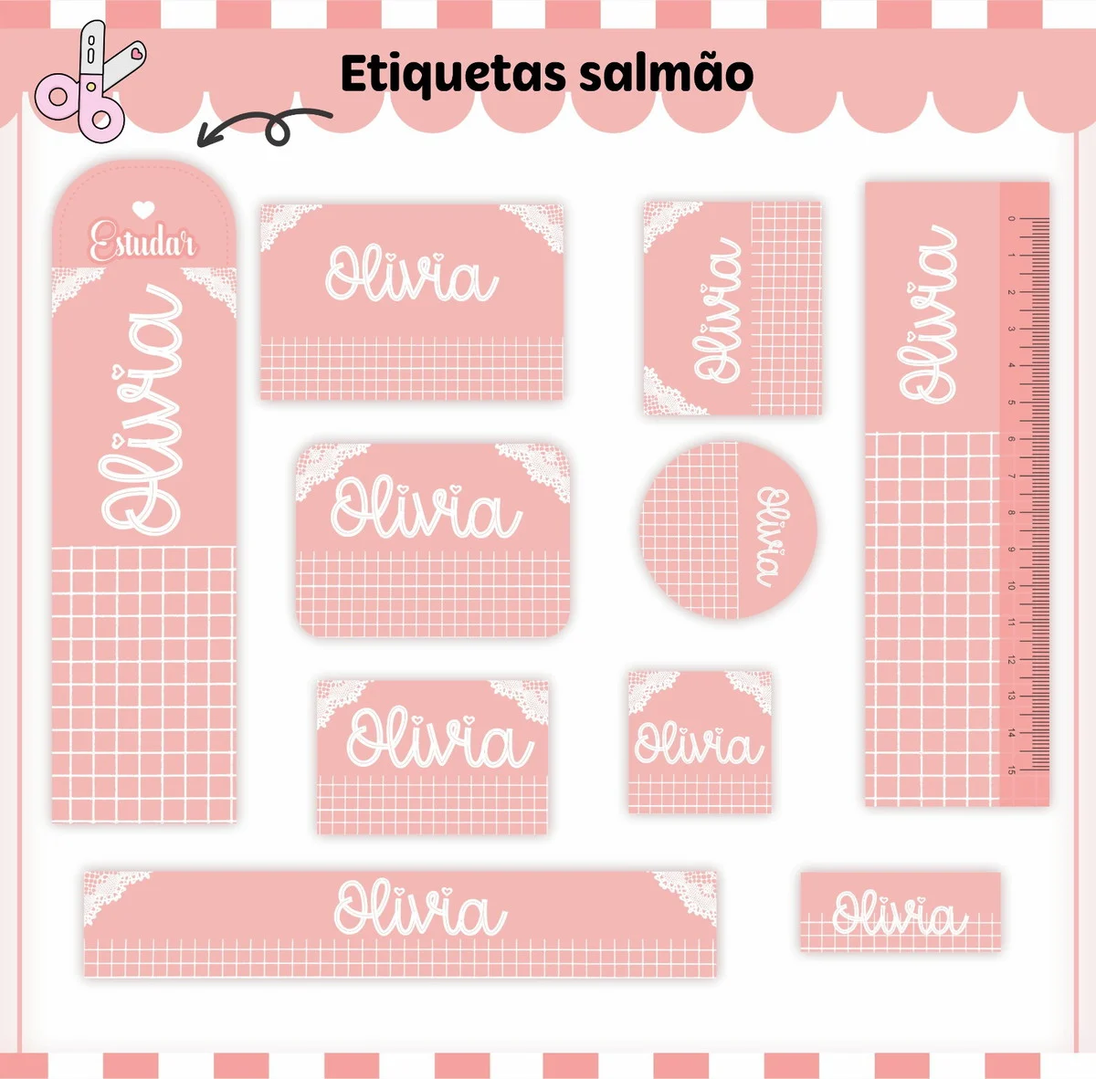 Arquivo Etiqueta Escolar Neutro Salmão. Ideal para o início do ano letivo, aniversários, eventos escolares ou para facilitar a identificação de materiais de uso coletivo,