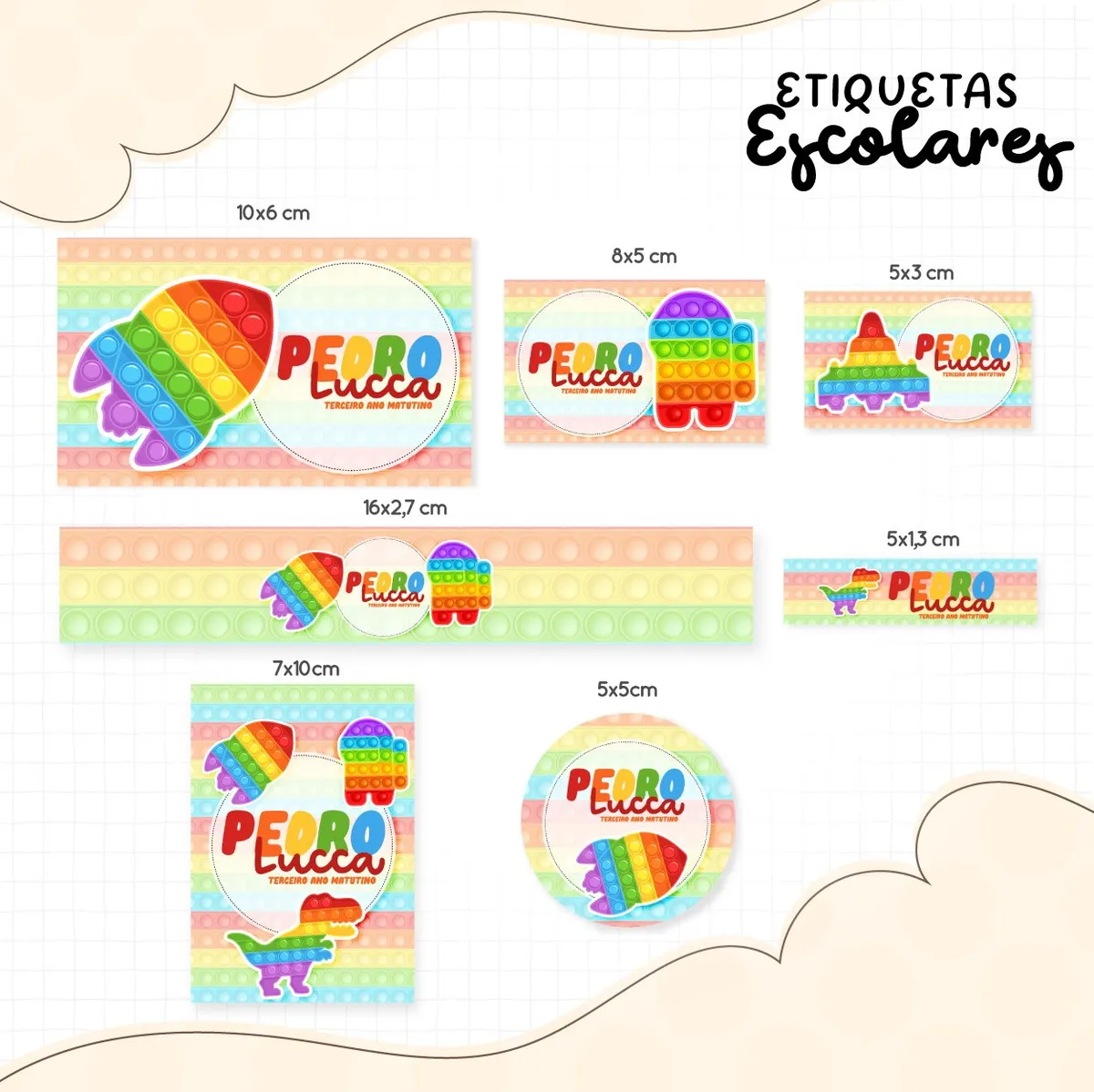 Arquivo Etiqueta Escolar Tema Pop It. Ideal para o início do ano letivo, aniversários, eventos escolares ou para facilitar a identificação de materiais de uso coletivo,