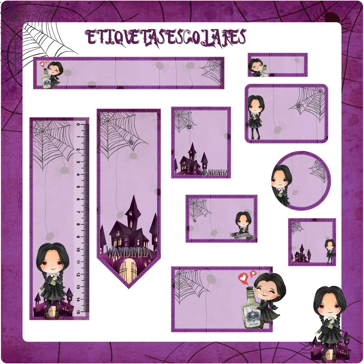 Arquivo Etiqueta Escolar Wandinha Studio. Ideal para o início do ano letivo, aniversários, eventos escolares ou para facilitar a identificação de materiais de uso coletivo,