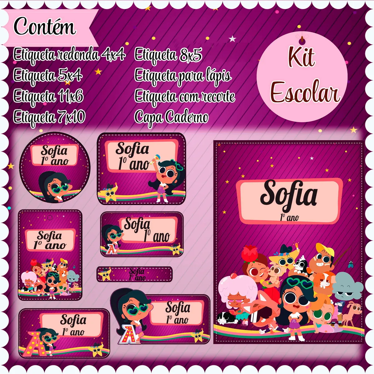 Etiqueta Escolar Anittinha Studio, Png e Pdf. Ideal para o início do ano letivo, aniversários, eventos escolares ou para facilitar a identificação de materiais de uso coletivo,