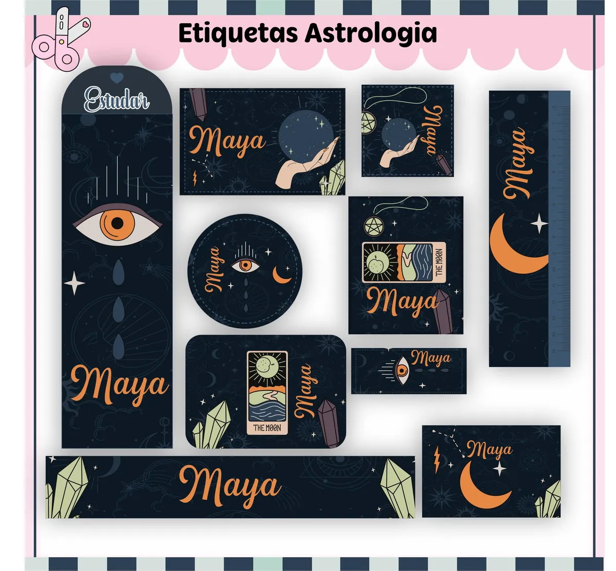 Etiqueta Escolar Astrologia Studio, Png e Pdf. Ideal para o início do ano letivo, aniversários, eventos escolares ou para facilitar a identificação de materiais de uso coletivo,