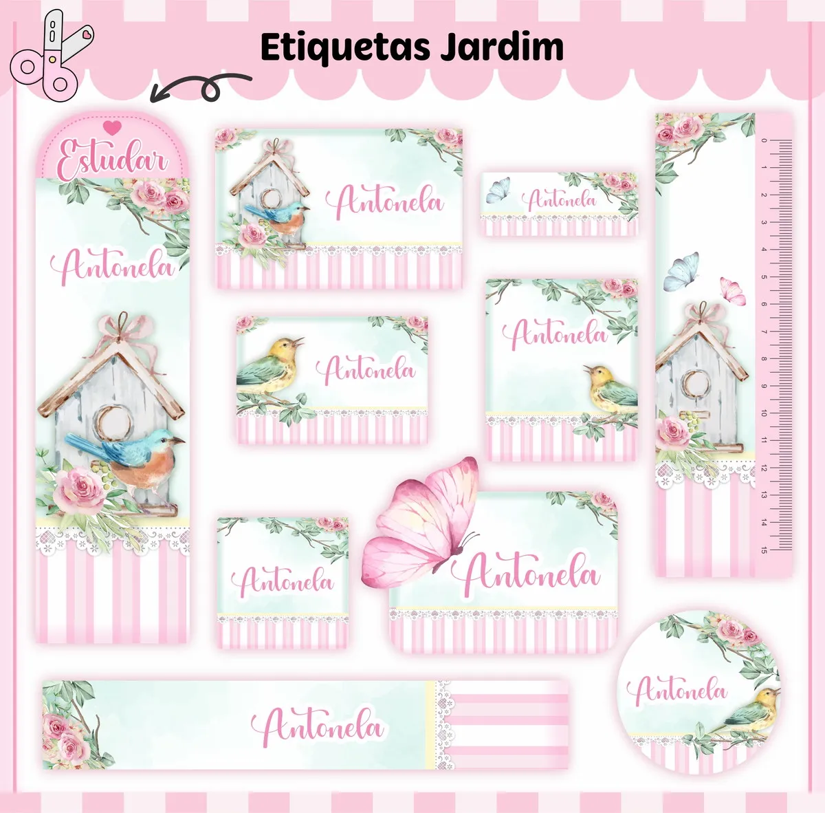 Etiqueta Escolar Jardim Studio, Png e Pdf. Ideal para o início do ano letivo, aniversários, eventos escolares ou para facilitar a identificação de materiais de uso coletivo,