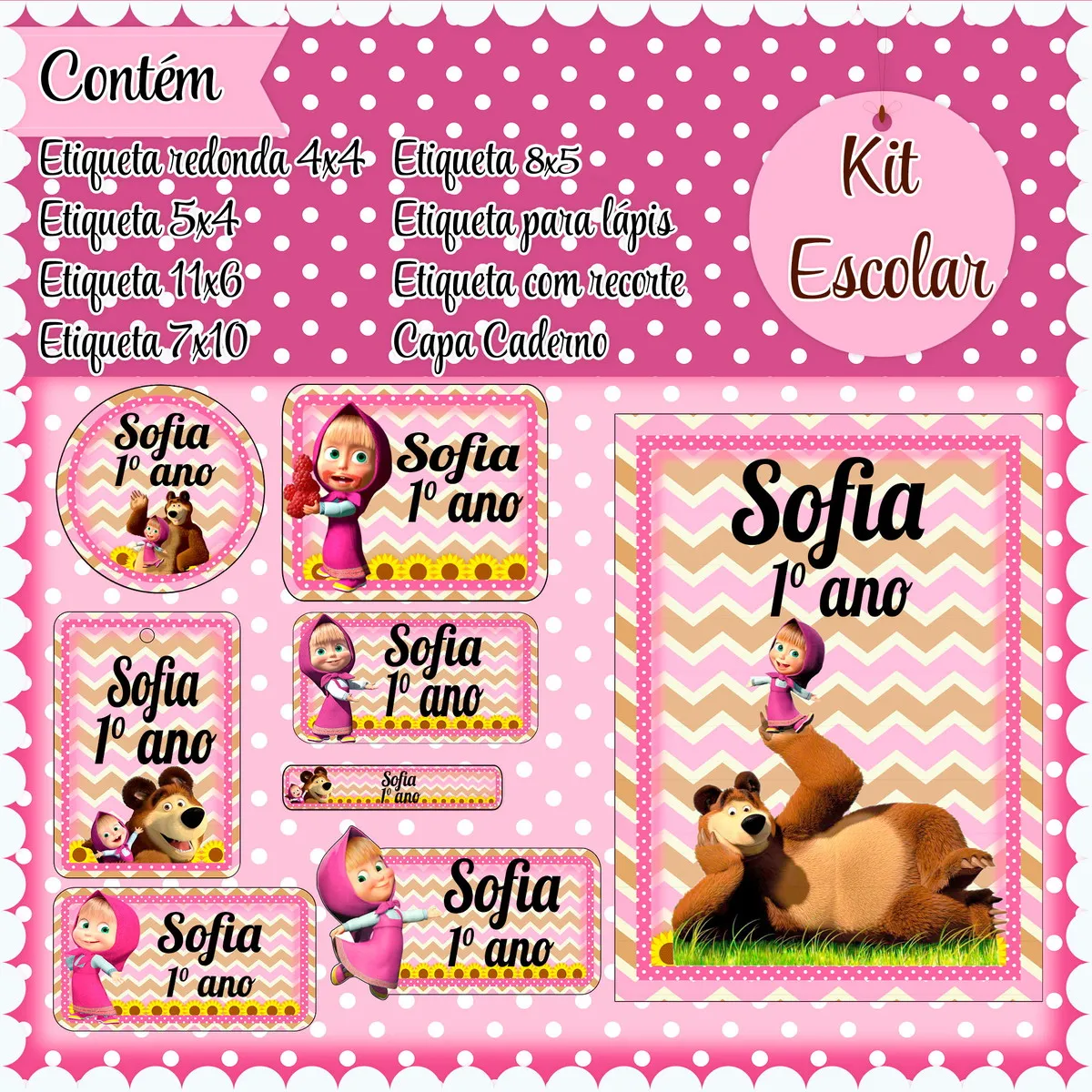 Etiqueta Escolar Masha Studio, Png e Pdf. Ideal para o início do ano letivo, aniversários, eventos escolares ou para facilitar a identificação de materiais de uso coletivo,