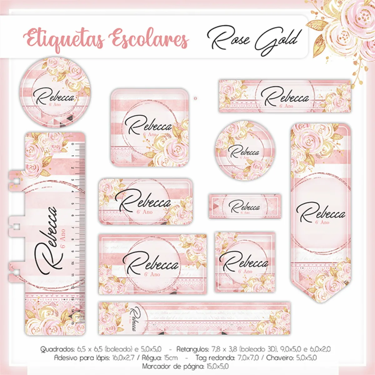 Etiqueta Escolar Rose Gold Studio e Pdf. Ideal para o início do ano letivo, aniversários, eventos escolares ou para facilitar a identificação de materiais de uso coletivo,