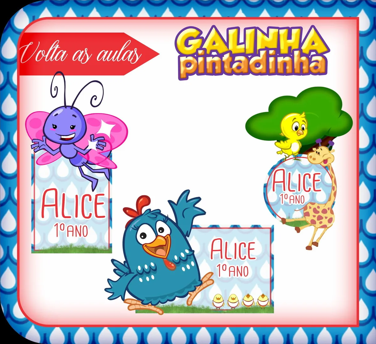 Etiqueta Escolar Tema Galinha Studio. Ideal para o início do ano letivo, aniversários, eventos escolares ou para facilitar a identificação de materiais de uso coletivo,