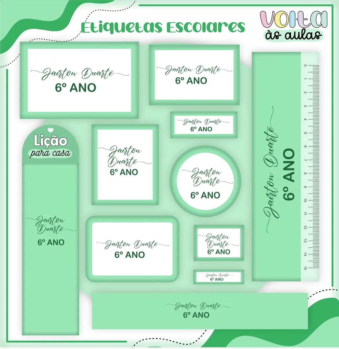 Etiqueta Escolar Tema Neutro Verde. Ideal para o início do ano letivo, aniversários, eventos escolares ou para facilitar a identificação de materiais de uso coletivo,