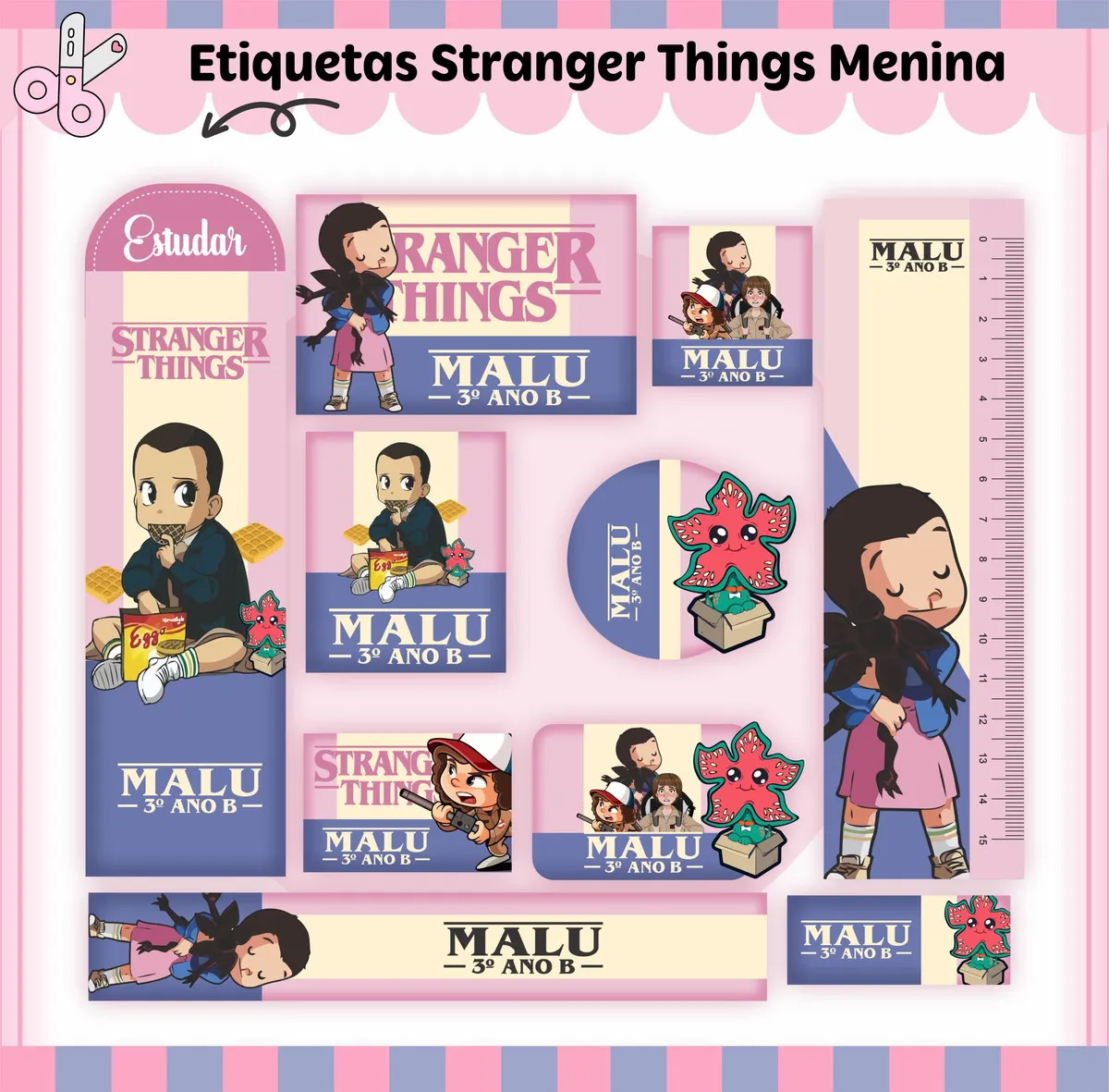 Etiqueta Escolar Tema Stranger Things. Ideal para o início do ano letivo, aniversários, eventos escolares ou para facilitar a identificação de materiais de uso coletivo,