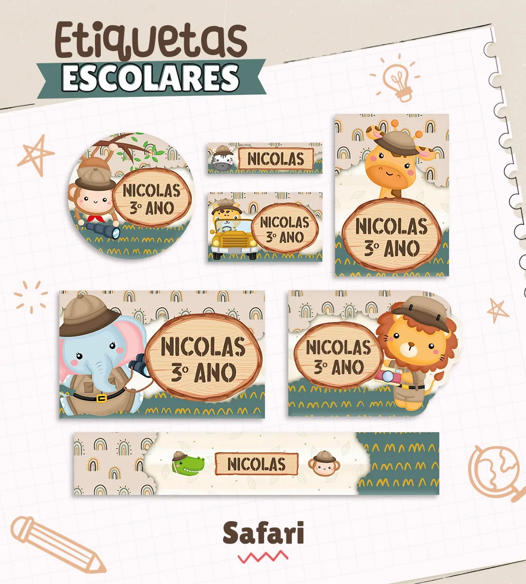 Etiqueta Escolare Personalizada Safari. Ideal para o início do ano letivo, aniversários, eventos escolares ou para facilitar a identificação de materiais de uso coletivo,